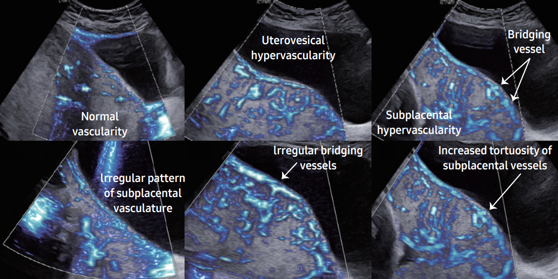 Другой способ оценки, визуализации и диагностики Placenta accreta spectrum (PAS) в системах Samsung использует аномальную гиперваскуляризацию и сложные сосудистые сети в плаценте, параметрии и маточно-пузырном интерфейсе. MV-Flow и LumiFlow — это недавно разработанные допплеровские технологии, способные обеспечить детальное представление о кровотоке по отношению к окружающим тканям в качестве альтернативы энергетическому допплеру для визуализации микроциркуляторных структур с медленным кровотоком сосудистых соединений.