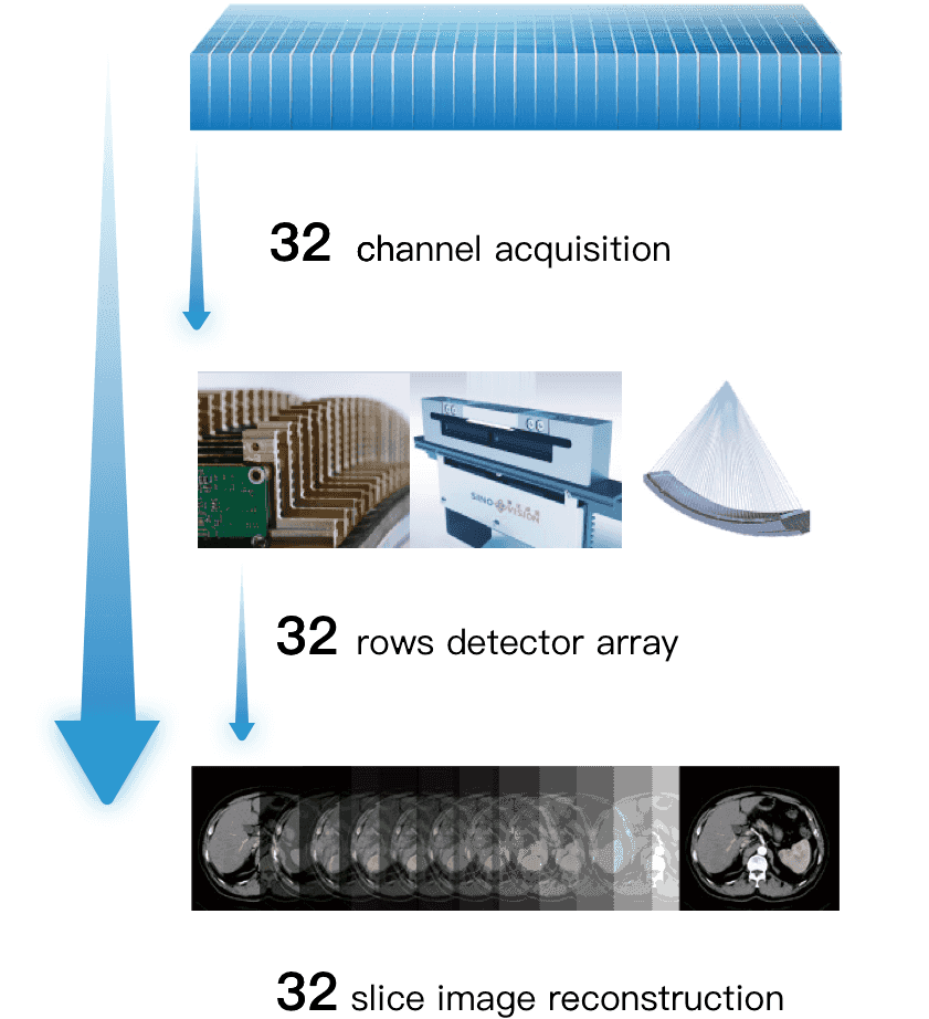 Настоящий 32-рядный физический детекторный модуль с воссозданием 32 изображений за один оборот. Качество изображения в формате Full HD, с высокой скоростью и тонким срезом