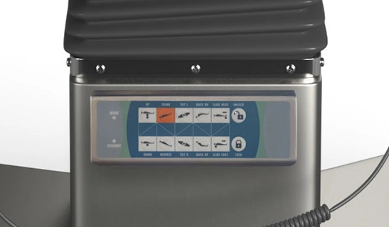Управление функциональными положениями стола осуществляется посредством проводного пульта, а также дублирующей панели, расположенной в колонне стола. Надежность электромеханического привода дополнительно обуславливается отсутствием масла в системе, что исключает его утечку.
