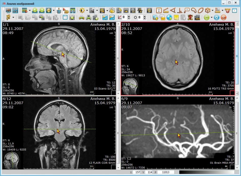 - Мультипланарная реконструкция (MPR) выбранной серии изображений во взаимно перпендикулярных плоскостях