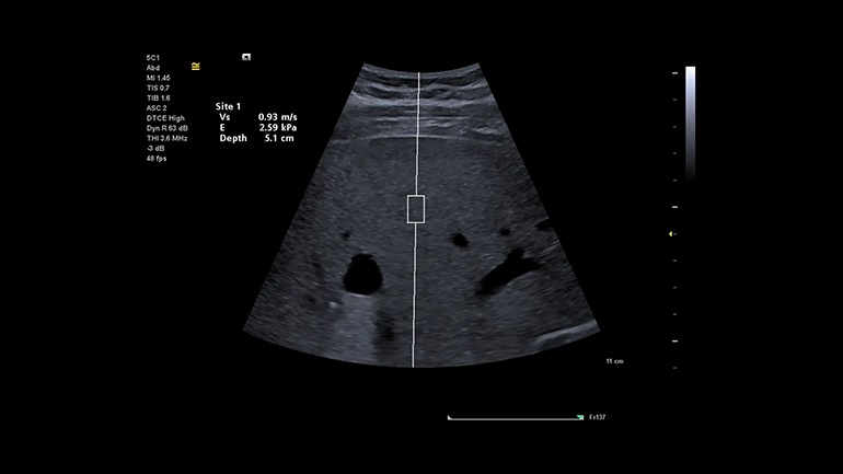 Технология оценки скорости распространения поперечной волны и эластичности в выбранной области интереса (Virtual Touch quantification). Метод измерения скорости поперечных (сдвиговых волн) в режиме реального времени, в котором используются низкочастотные акустические импульсы (ARFI), генерируемые непосредственно ультразвуковым датчиком. Оценка скоростей сдвиговых волн в выбранной врачом зоне интереса коррелирует с показателями жесткости ткани.