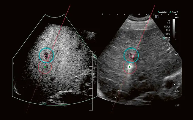 Визуализация с затуханием позволяет визуализировать и измерять коэффициент затухания жировой ткани печени. Усовершенствованные фильтры удаляют из результатов измерения такие структуры, как сосуды и кальцификации, что обеспечивает надежные результаты.